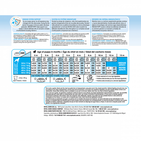 Medium-sized dogs are famous for their energy. As puppies, their little bodies are doing double duty: rapidly developing bone structure and natural defenses while playing hard all day. They need right-sized nutrition to help them sustain this rapid growth period. Royal Canin Medium Puppy dry dog food is wholesome puppy food for a healthy start in your puppy’s life. An exclusive mix of antioxidants and minerals supports their developing immune systems and keeps their bodies growing strong. Starting your puppy off with this complete and balanced diet also helps them develop strong bones and joints. And the exclusive kibble design helps your pup chew their food properly. The highly digestible proteins and prebiotic ingredients also help to break down the food and support healthy digestion and optimal stools.• FORMULATED FOR MEDIUM BREED PUPPIES: Royal Canin Medium Puppy Dog Food is tailor-made for puppies up to 1 year old with an expected adult weight of 23-55 lb• HEALTHY ENERGY: Key nutrients meet the high energy needs of medium breed dogs during their short growth period• IMMUNE SUPPORT: An exclusive blend of antioxidants and vitamins promotes healthy development of immune systems• BONE AND JOINT: A specialized mineral blend supports bone and joint health• HEALTHY DIGESTION: Highly digestible proteins and prebiotics promote healthy digestion and optimal stool quality