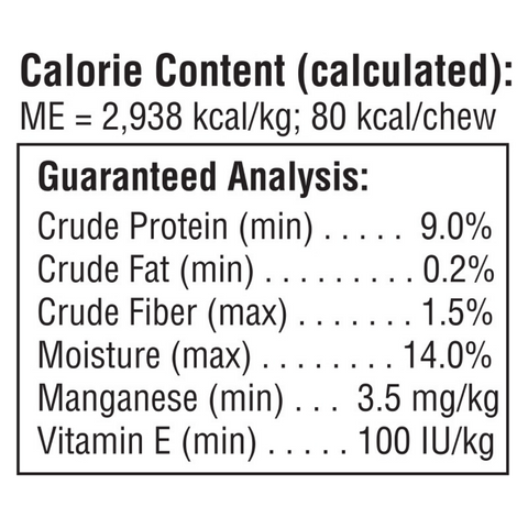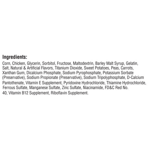 Corn, Chicken, Glycerin, Sorbitol, Peanut Butter, Fructose, Maltodextrin, Barley Malt Syrup, Gelatin, Salt, Natural & Artificial Flavors, Titanium Dioxide, Sweet Potatoes, Peas, Carrots, Xanthan Gum, Dicalcium Phosphate, Sodium Pyrophosphate, Potassium Sorbate (Preservative), Sodium Propionate (Preservative), Sodium Tripolyphosphate, D-Calcium Pantothenate, Vitamin E Supplement, Pyridoxine Hydrochloride, Thiamine Hydrochloride, Ferrous Sulfate, Manganese Sulfate, Zinc Sulfate, Niacinamide, FD&C Red No. 40, Vitamin B12 Supplement, Riboflavin Supplement
