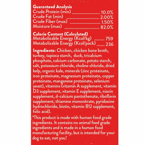Chicken, chicken bone broth, turkey, tapioca starch, duck, tricalcium phosphate, calcium carbonate, potato starch, salt, potassium chloride, choline chloride, dried kelp, organic kale, minerals (zinc proteinate, iron proteinate, magnesium proteinate, copper proteinate, manganese proteinate, selenium yeast), vitamins (vitamin A supplement, vitamin D3 supplement, vitamin E supplement, niacin supplement, d-calcium pantothenate, riboflavin supplement, thiamine mononitrate, pyridoxine hydrochloride, biotin, vitamin B12 supplement, folic acid).
