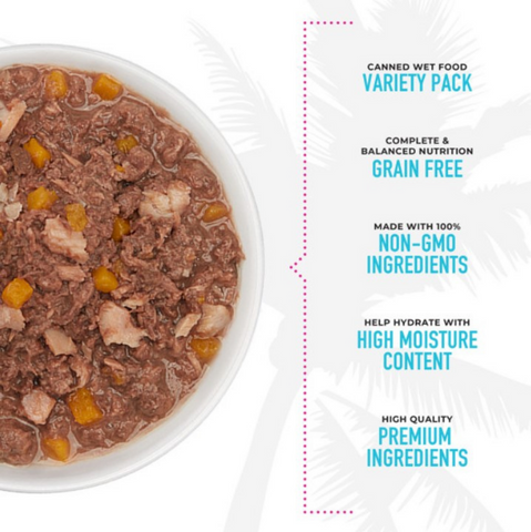 12-can Variety Pack featuring 4 Grain Free Flavors:3 cans of Tuna with Tilapia and Pumpkin3 cans of Tuna with Ocean Whitefish and Pumpkin3 cans of Tuna with Shrimp and Pumpkin3 cans of Tuna with Calamari and PumpkinMade with whole fish & pumpkin, Tiki Cat® Aloha Friends™brand cat food provides a complete and balanced, and highly digestible diet for cats.-Fresh, Sustainably Sourced Ingredients that are GMO and Gluten Free-Wild Caught, Dolphin Safe Tuna, Mercury Tested for Safety-With Pumpkin, a High Moisture, Gentle Fiber, Rich in Antioxidants-Hand-Packed in Human-Grade Facilities-Complete & Balanced for All Life Stages-Grain Free