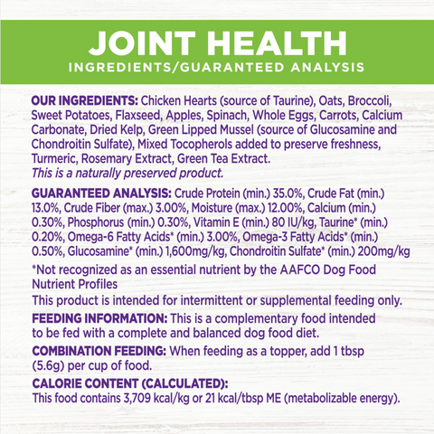 Chicken Hearts (source of Taurine), Oats, Broccoli, Sweet Potatoes, Flaxseed, Apples, Spinach, Whole Eggs, Carrots, Alfalfa, Dried Kelp, Glucosamine Hydrochloride, Chondroitin Sulfate, Turmeric, Rosemary Extract, Green Tea Extract.Guaranteed Analysis