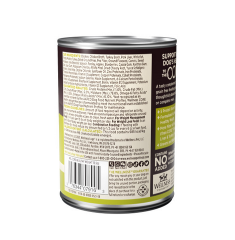 Wellness CORE Grain Free Natural Weight Management Chicken, Pork Liver, Whitefish and Turkey Recipe Wet Canned Dog Food is completely free of grains and is made with high quality chicken, pork liver, whitefish and turkey with added fruits and vegetables for extra fiber to help achieve and maintain a healthy weight for your dog! This recipe is rich in fiber and will keep your dog full for a longer period of time. Another added benefit of this recipe is that omega fatty acids like fish and flaxseed is blended for healthy skin and coat.