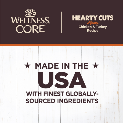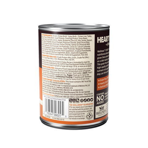 Wellness CORE Natural Grain Free Hearty Cuts Chicken and Turkey Canned Dog Foodis a delicious and balanced meal made with Hearty cuts of Chicken and Turkey. This recipe is in a super tasty gravy that your dog is sure to love. As a standard for Wellness this poultry-packed recipe has no wheat, corn, soy, artificial colors, or preservatives.