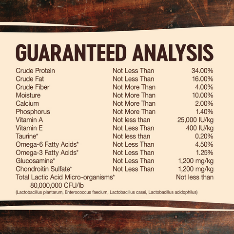 Deboned Turkey, Turkey Meal, Chicken Meal, Peas, Potatoes, Dried Ground Potatoes, Chicken Fat (preserved with Mixed Tocopherols), Tomato Pomace, Chicken Liver, Natural Chicken Flavor, Ground Flaxseed, Salmon Oil, Spinach, Vitamin E Supplement, Broccoli, Carrots, Choline Chloride, Parsley, Apples, Blueberries, Kale, Sweet Potatoes, Taurine, Mixed Tocopherols added to preserve freshness, Zinc Proteinate, Zinc Sulfate, Glucosamine Hydrochloride, Chondroitin Sulfate, Calcium Carbonate, Niacin, Ferrous Sulfate, Iron Proteinate, Beta-Carotene, Vitamin A Supplement, Copper Sulfate, Thiamine Mononitrate, Copper Proteinate, Manganese Proteinate, Manganese Sulfate, d-Calcium Pantothenate, Sodium Selenite, Pyridoxine Hydrochloride, Riboflavin, Chicory Root Extract, Yucca Schidigera Extract, Vitamin D3 Supplement, Biotin, Calcium Iodate, Vitamin B12 Supplement, Folic Acid, Ascorbic Acid (Vitamin C), Dried Lactobacillus plantarum Fermentation Product, Dried Enterococcus faecium Fermentation Product, Dried Lactobacillus casei Fermentation Product, Dried Lactobacillus acidophilus Fermentation Product, Rosemary Extract, Green Tea Extract, Spearmint Extract.This is a naturally preserved product.Guaranteed Analysis