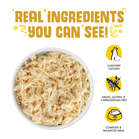 Chicken (Boneless, Skinless Breast), Chicken Broth, Sunflower Seed Oil, Potato Starch, Tricalcium Phosphate, Xanthan Gum, Choline Chloride, Zinc Sulfate, Vitamin E Supplement, Ferrous Sulfate, Thiamine Mononitrate (Vitamin B1), Nicotinic Acid (Vitamin B3), Calcium Pantothenate, Vitamin A Supplement, Potassium Iodide, Manganese Sulfate, Copper Sulfate, Riboflavin Supplement (Vitamin B2), Pyridoxine Hydrochloride (Vitamin B6), Folic Acid, Vitamin D3 Supplement, Vitamin B12 SupplementGuaranteed Analysis